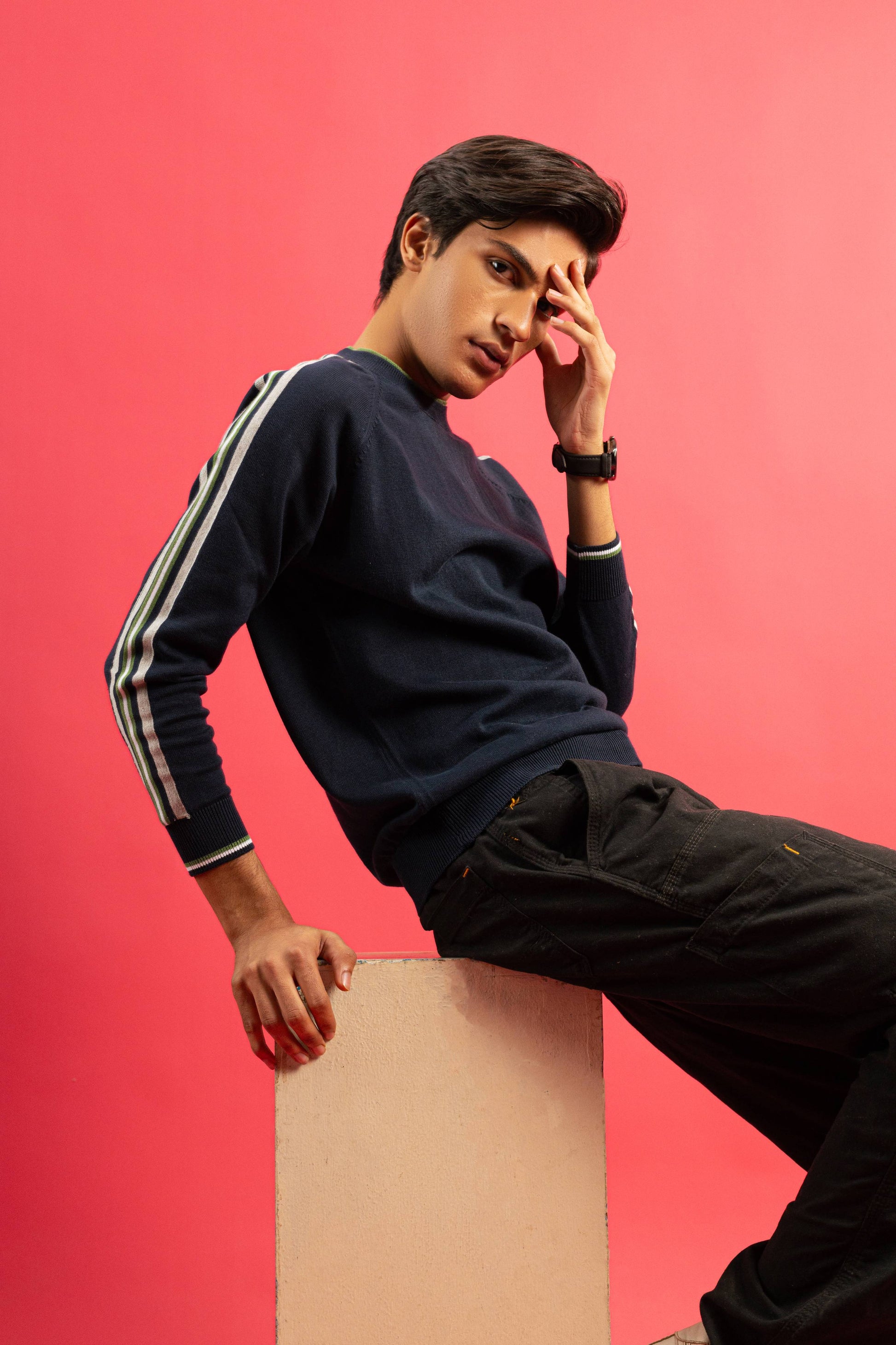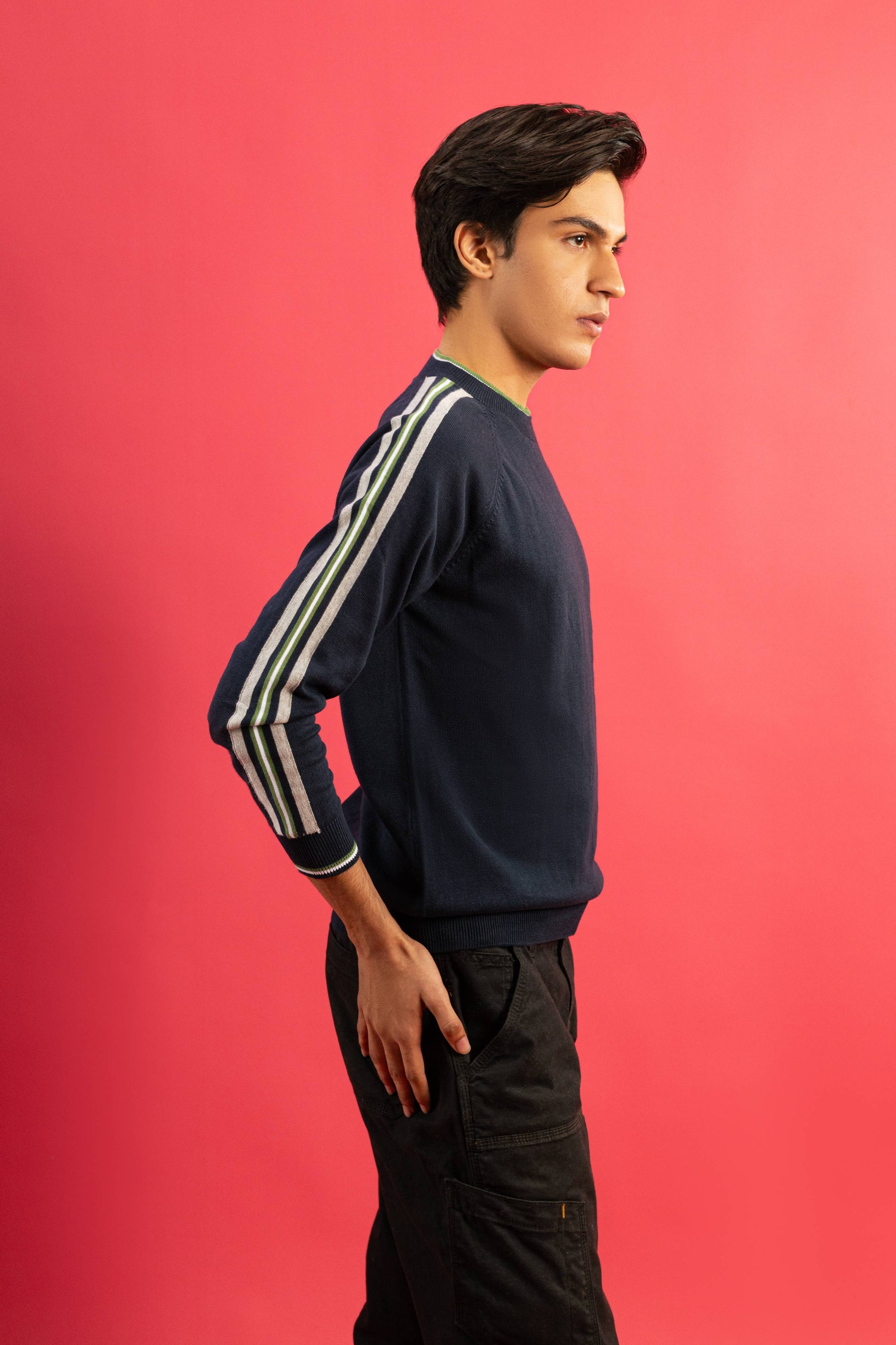 A sleek and sporty navy sweater featuring bold white and green stripe accents, designed for a perfect balance of comfort and style in your casual wardrobe.