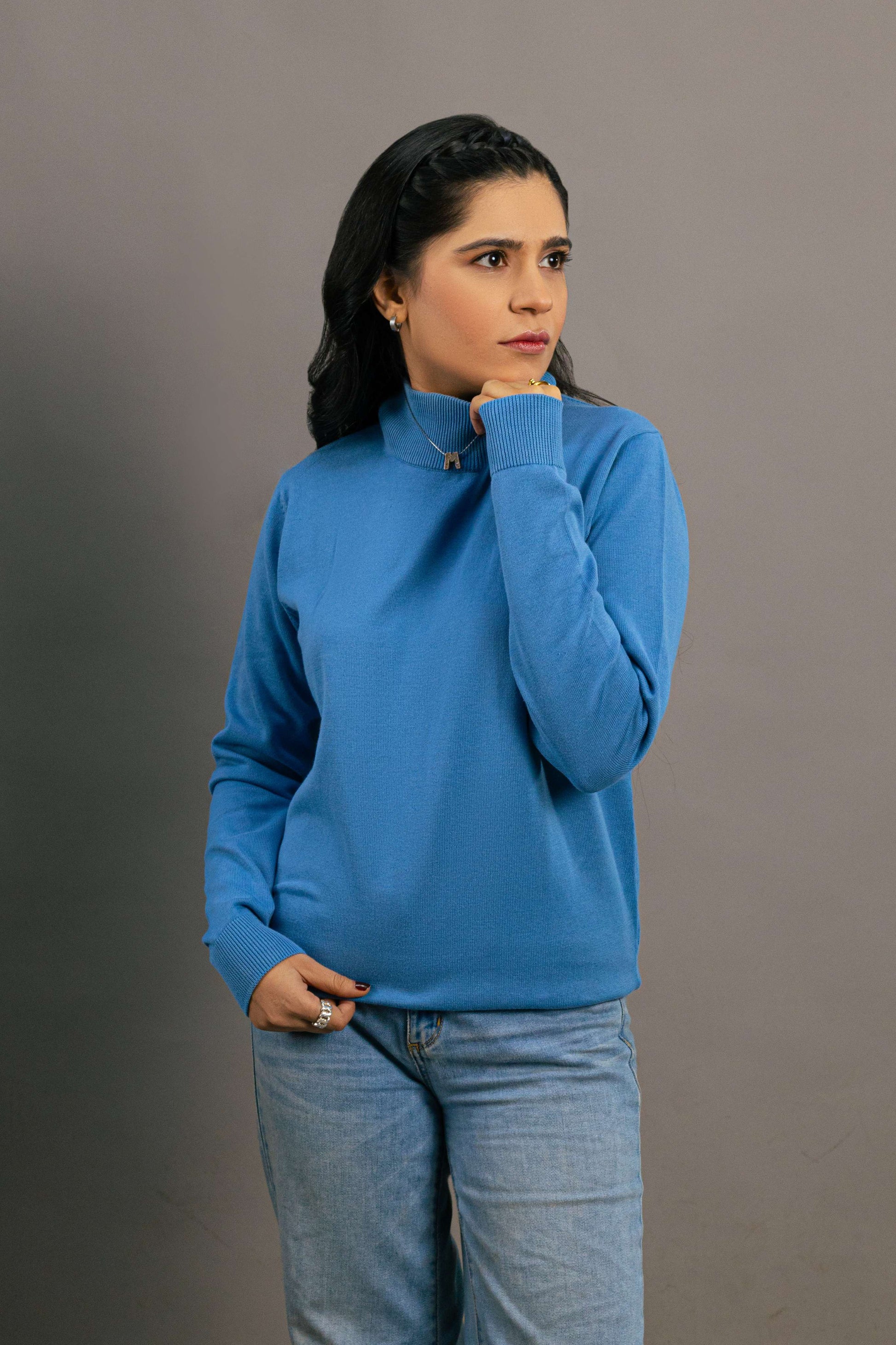A sleek and elegant turtleneck sweater in a calming azure blue shade, perfect for adding sophistication to your wardrobe. This sweater is an essential choice for those who value comfort and timeless elegance in their style.