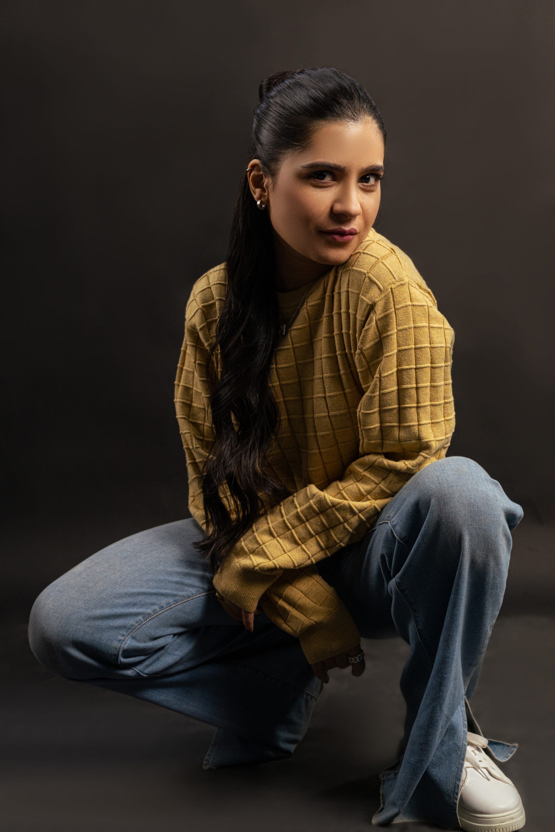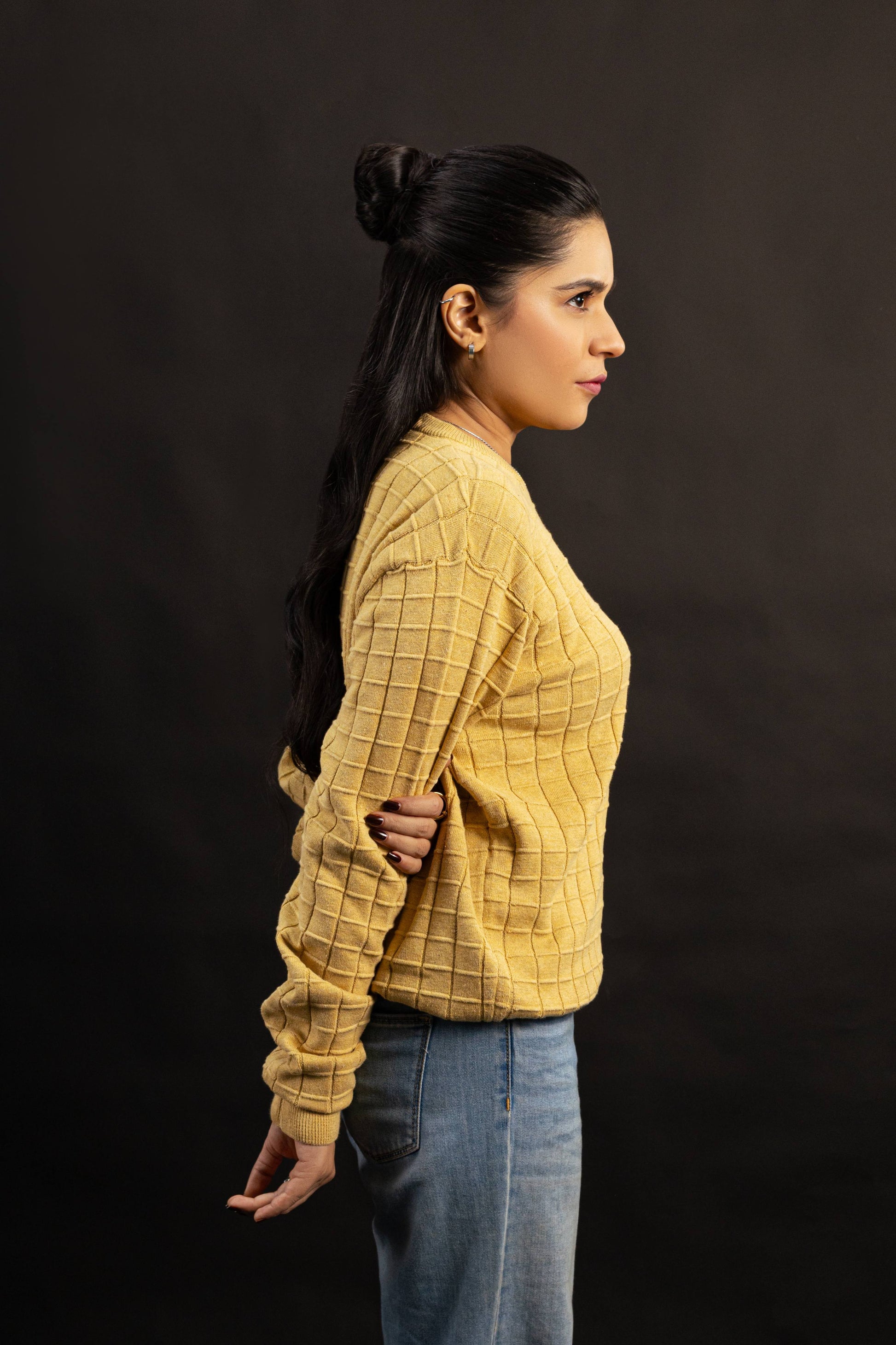 Crafted from 100% color-finned cotton, this mustard grid-textured knit sweater combines timeless style with all-day comfort. Its relaxed fit and ribbed details make it a versatile wardrobe essential for any season.