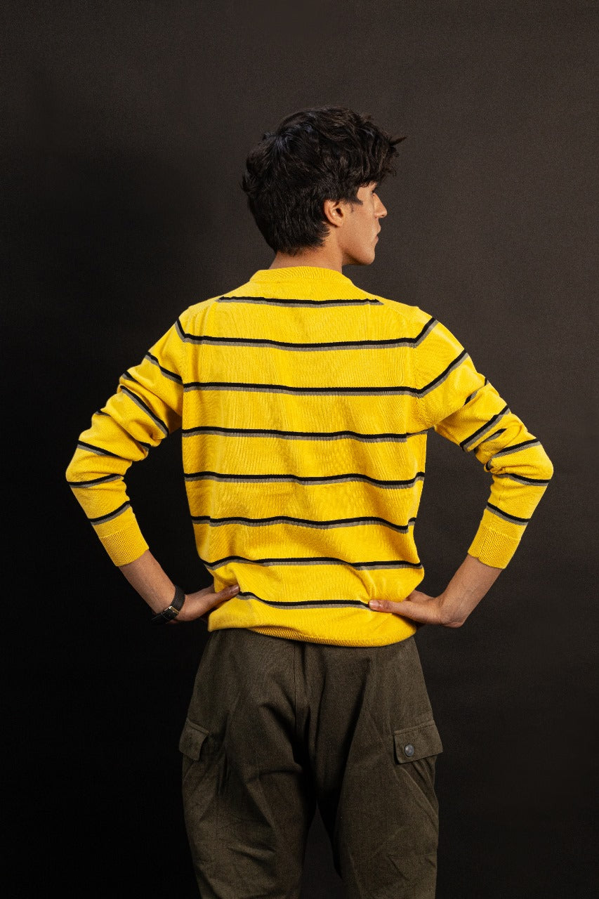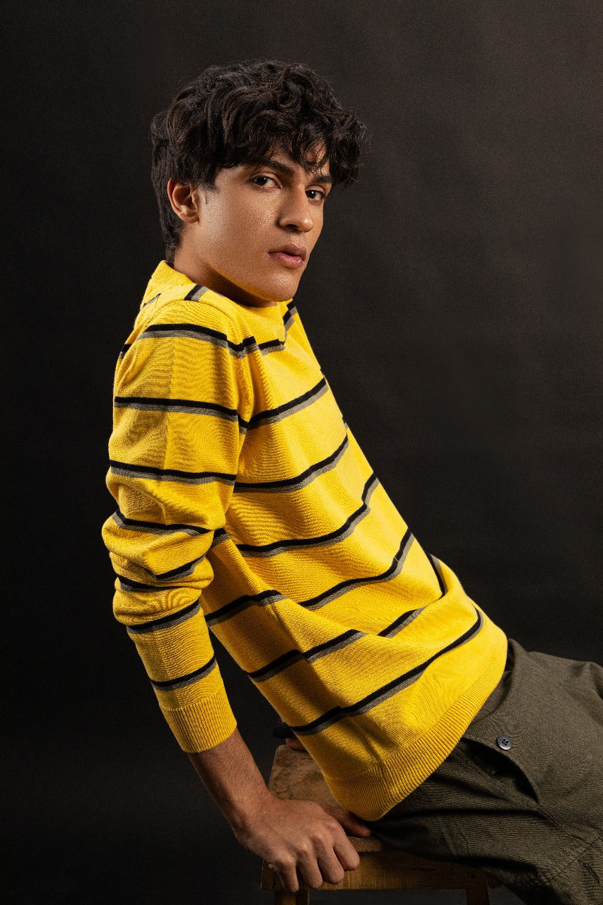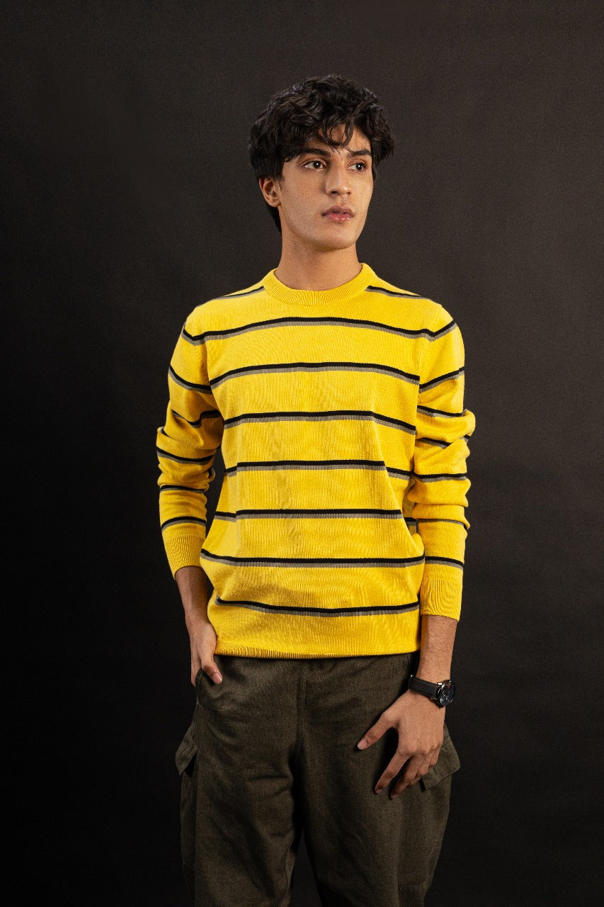 Featuring a classic crew neckline, ribbed cuffs, and a relaxed fit, it’s perfect for effortless layering. The vibrant yellow base with sleek black stripes adds a modern touch, making it a versatile wardrobe essential.