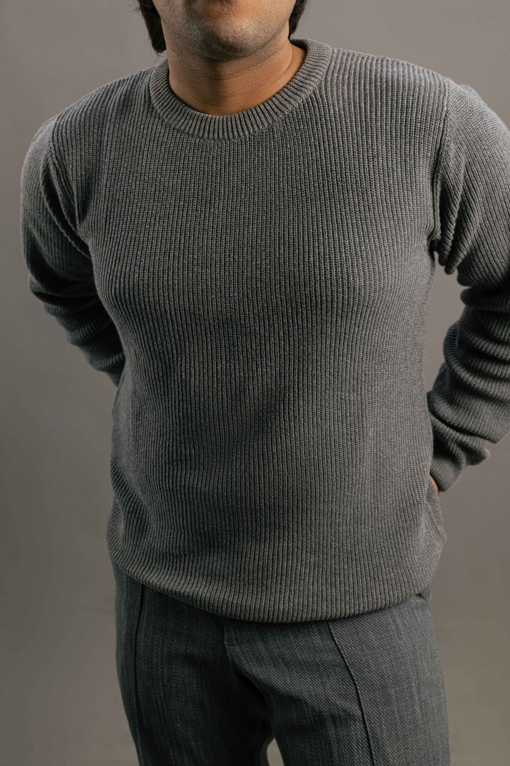 A refined and stylish sweater, designed with a luxurious ribbed texture in a timeless charcoal gray, crafted from 100% color-finned cotton for an effortlessly chic look.
