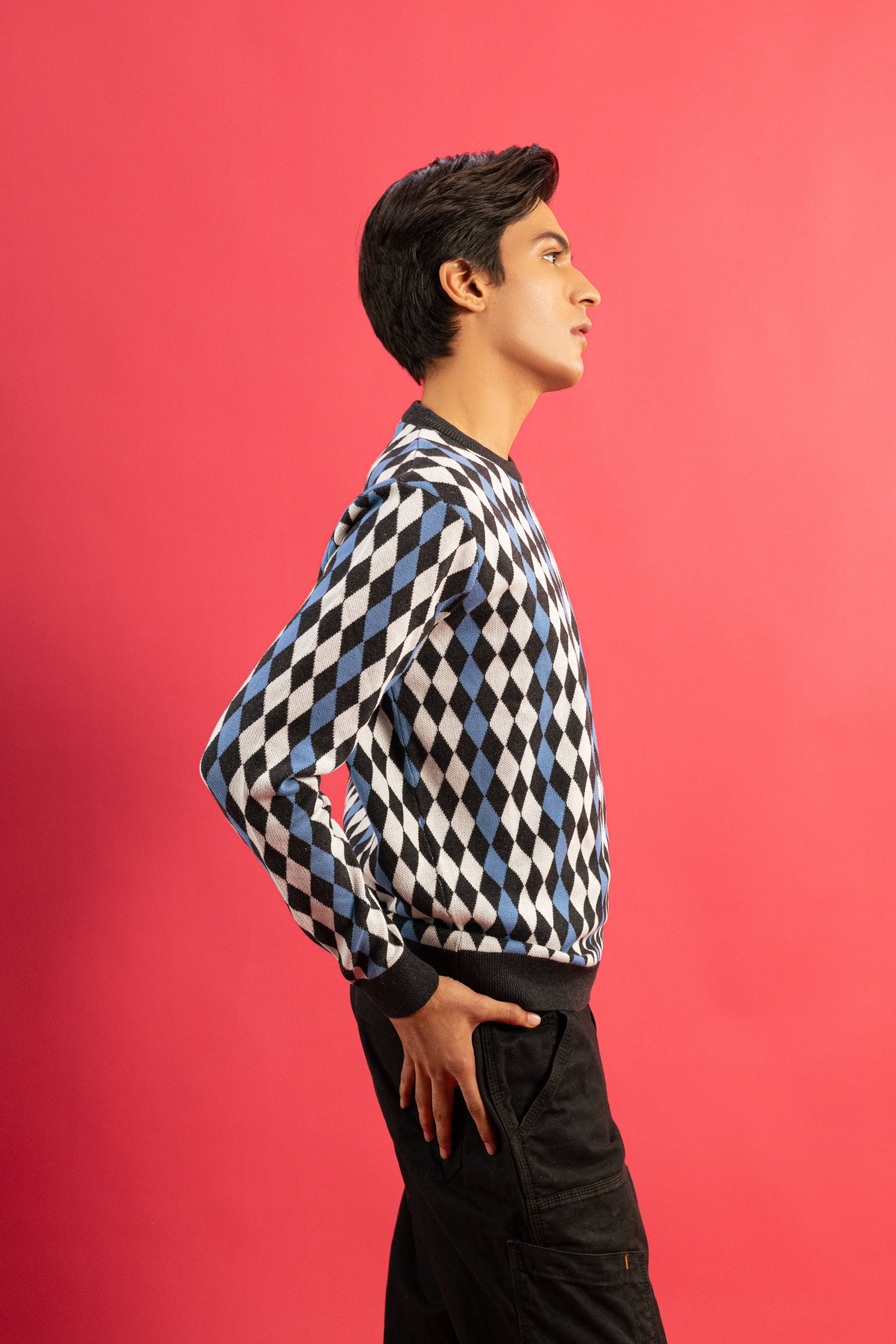 Add a touch of sophistication and warmth to your wardrobe with this stylish Argyle Pattern Knit Sweater. The timeless harlequin diamond design combines a chic mix of black, white, and sky-blue colors, perfect for casual outings or layering in cooler seasons.