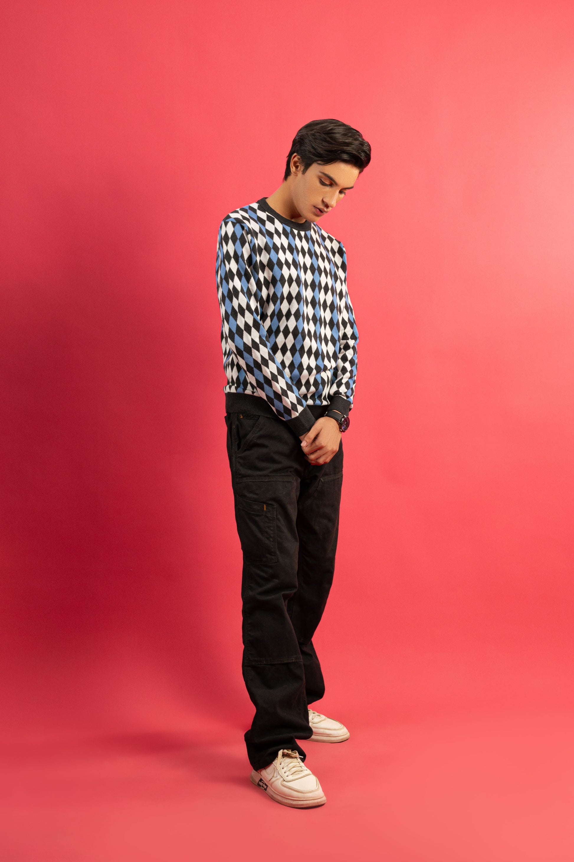 • Argyle Pattern: Showcases a bold, geometric argyle design in black, white, and blue, offering a sophisticated and eye-catching aesthetic.